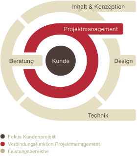 Das Ergebnis entsteht arbeitsteilig aus dem Beitrag des Kunden und den fünf Disziplinen: Beratung, Inhalt & Konzeption, Design, Technik und Projektmanagement. Aus dieser intensiven Zusammenarbeit entstehen neue Ideen und strategische Lösungsansätze.